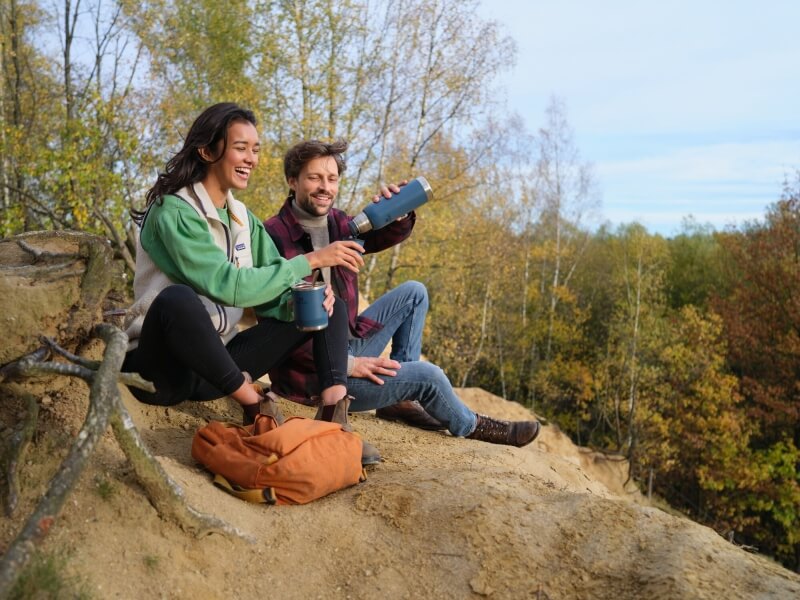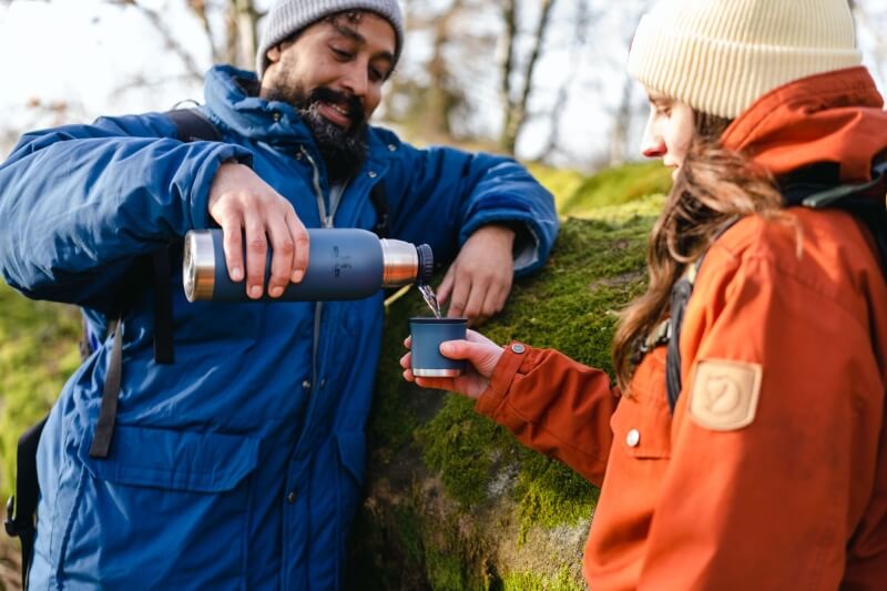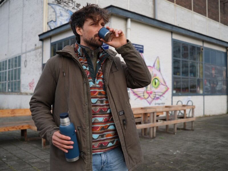 Ak viečko slúži ako pohárik, kalíšok je dvojstenný – vnútorná strana plastová bez BPA, vonkajšia strana nerezová oceľ. Plast zaisťuje izoláciu pre príjemné a bezpečné držanie kalíška v ruke. Oceľ zaisťuje jeho odolnosť.