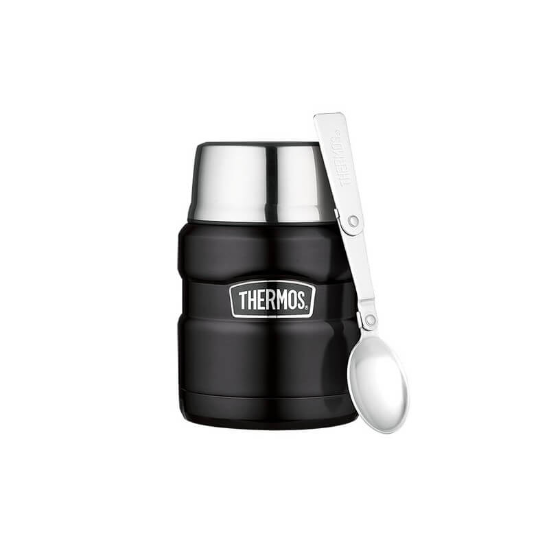 Thermos Style termoska na jedlo so skladacou lyžicou a šálkou – nerezová vákuovo izolovaná termoska na jedlo s integrovanou lyžicou a šálkou s objemom 470 ml v matne čiernom prevedení.