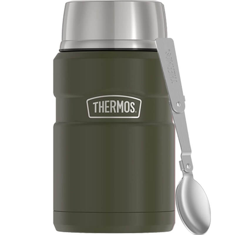 Thermos Style termoska na jedlo so skládacou lžičkou a šálkou – nerezová vákuovo izolovaná termoska na jedlo s integrovanou lžicou a šálkou s objemom 710 ml v prevedení vojenská zelená.