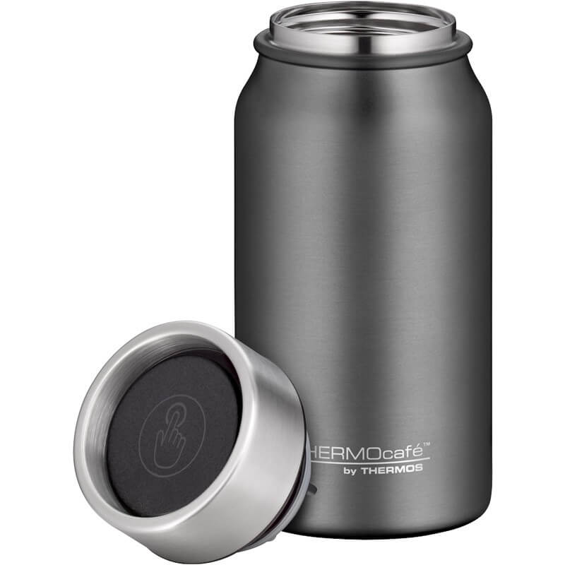 Termohrnček THERMOcafé – nerezový vákuovo izolovaný hrnček s tlačidlovým uzáverom. Ľahký a kompaktný termohrnček padne do väčšiny automobilových držiakov. Termohrnček je vodotesný v uzavretom stave. Jedným stlačením na tlačidlo sa uzáver spoľahlivo otvorí a zatvorí. Piť nápoj z uzáveru je možné po celom obvode uzáveru – nie je nutné hľadať otvor pre nápoj. Odnímateľný uzáver je možné hygienicky čistiť aj v umývačke riadu. Termohrnček je určený ako pre studené tak teplé či horúce nápoje.