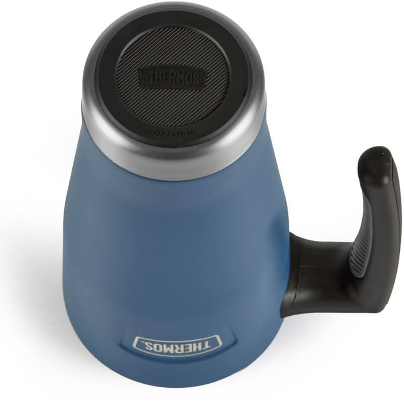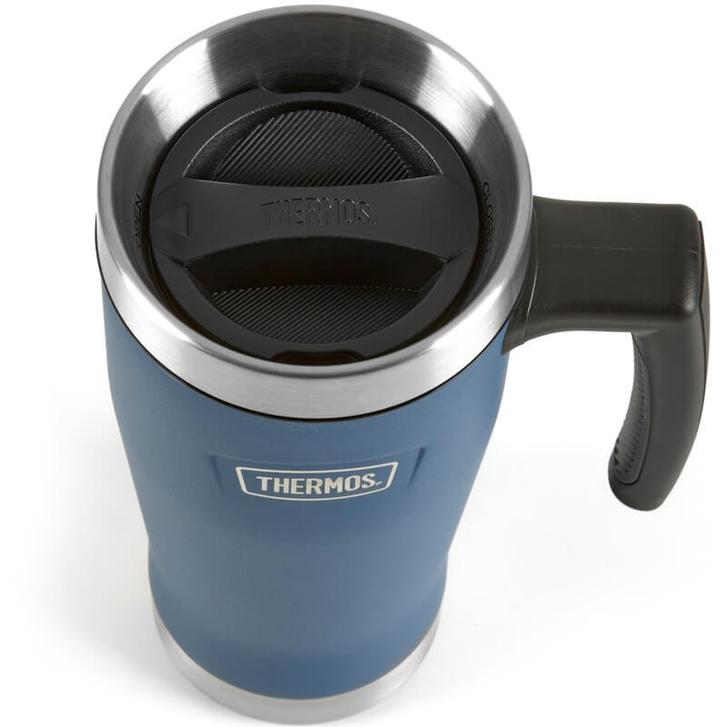 Thermos Icon – vodotesný nerezový vákuovo izolovaný termohrnček s madlom a otočným uzáverom s objemom 470 ml vo farebnom prevedení námornícka modrá.